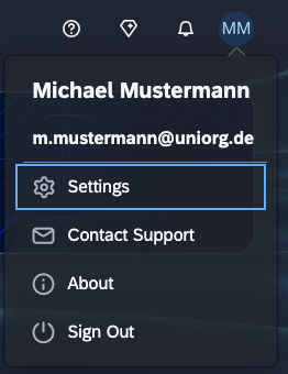 The user actions menu offers a range of user-specific services. It is accessed by clicking the icon on the right-hand side of the shell bar. The user actions menu is available in all UDINA screens.